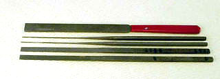 上から、黒い柄は「丸・半丸・平」3本セットのもの。オレンジの柄は半丸。赤い柄は平ヤスリ(模型屋さんでお馴染みのもので、大変使い易い)。白い柄はダイヤモンドヤスリ(こちらはプラスチックモデル用としては不適です。)。 |