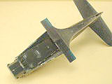 本機は爆撃機でもあり、爆弾を取り付けた状態にしたいので、スタンドの支柱は多少複雑な形状となりました。キット説明書の図面を原寸に拡大し、それに合わせてスタンドをデザインしています。下側主翼部品の内側と中央のダイブレーキの内側に、1.2ミリ厚のプラ板でスタンド支柱取付け用の補強をしておきました。 |