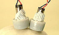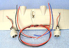 モーターは左右並列で、1.5Vで作動させます。スタンドベースへのコードから左右モーターへのコードを分岐させて、主翼中央部から挿入し、カウリング取付部へ導き、モーターのリード線と結線します。モーターの回転を確認して、最後にエンジン部を接着します。コードの結線部分は、補強を兼ねて、熱収縮チューブで絶縁しています。 |