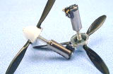 | ■プロペラ軸の取付け キットの軸は頑丈この上ないと思われるほどの太さ(従ってプロペラ側の軸穴径も大きい)です。軸のプロペラに挿入される部分を切断して、プロペラ側に埋め、新たに軸穴を開けるというお決まりの工法をとりましたが、直接エポキシパテで固定したほうが手っとり早そうでした。軸径は1ミリです。(参照:「プロペラ軸の取付け」) |