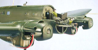 | ■エンジンポッドの取付け モーターをセットしたエンジンポッドを、機体に取り付け、電源からのコードをモーターに結線します。切り離されたエンジンポッド下部は接着しないで挿入しておくだけにしました。 この濃緑色のプラスチック素材は、接合箇所の状態が見にくく、下塗りをしたあとでないときちんと整形されているか判然しません。素材の色はやはりグレーが良いようです。 |