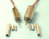 ホームセンターなどで売っている、各サイズのアルミや真鍮パイプのそれぞれの内径に近いものを、ドリル針(ドリル針は、0.1ミリステップぐらいで市販されています)で調節しながら組合せ、目的の内径にしました。たとえば、モーター軸が0.7ミリΦプロペラ軸が1.5ミリΦなら、「外径1.0/内径0.6」「外径1.4/内径1.0」「外径2.1/内径1.5」の3種類のサイズのアルミパイプを使い、ドリル針で調節しながら組み立てます。プロペラ軸のくわえ代は3ミリほどあればよく、モーター軸のほうはモーター軸長に対応させます。外径1.4と内径1.5の組合せでは、約0.1ミリのギャップがあり、また、ドリル針での内径の調整時、注意深く作業を進めないと、うまくセンターがとれないことがほとんどでした。若干プロペラを回転させたときブレが出ますが、まあ使えます。(工作は、アルミパイプが柔らかくてやりやすいようです。) この後に紹介する熱収縮パイプによるものを開発するまでは全てこの方法をとっていました。