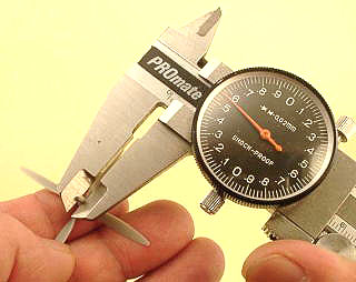 プロペラの軸径を計ったところ(写真では1/72スピットファイヤー)、平均で1.5ミリというところでした。ストックの、4ミリΦモータの軸径は0.6ミリ、6ミリΦモーターは0.7ミリありましたから、これに合わせて1.5ミリΦの軸を持つプロペラ用のジョイントの製作です。モータ側は0.5ミリ/0.6ミリΦと実寸より0.1ミリ細くして、プロペラ側は実寸の1.5ミリΦとしました。 |