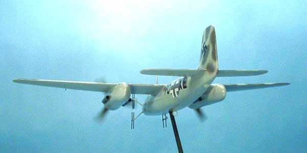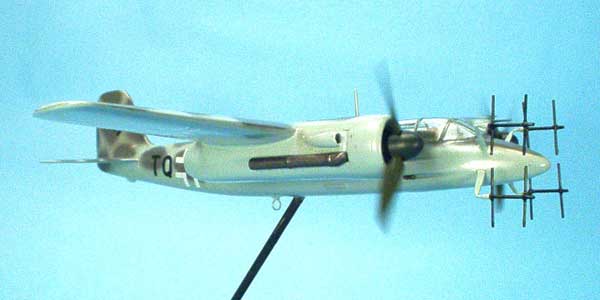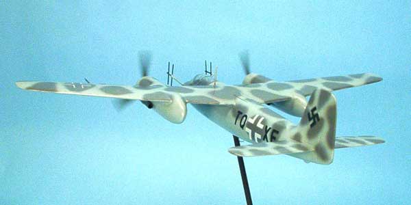 ■Fw−Ta154 夜間戦闘機 キット:1/72 PIONEER2 モーター:6ミリΦモーター スタンド:箱型、 単4−2本 角張った主翼を肩に乗せ、機首の触覚のようなアンテナ群が特徴的な双発夜間戦闘機。単発戦闘機「Fw-190」を設計したフォッケウルフ社のクルト・タンクの設計によるものです。イギリスのモスキートに対抗して開発されたそうで、同じように木製でニックネームも「Moskito」。 「工作室」(第48回)で製作したモデルです。 |