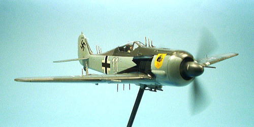 先端をしぼり込んだカウリングと、直線を基調にした主・尾翼、シャープな風防のザインが魅力的な飛行機です。地上姿勢では、長い主脚のせいか少し頼りなさそうですが、一転、飛行姿勢では、頭でっかちに見える空冷エンジンで獰猛で精悍な雰囲気となります。この塗装のモデルでは、(夜間戦闘機タイプということからか)排気口の上部に、上空から排気炎を見えにくくするための「ひさし」が付いていました。